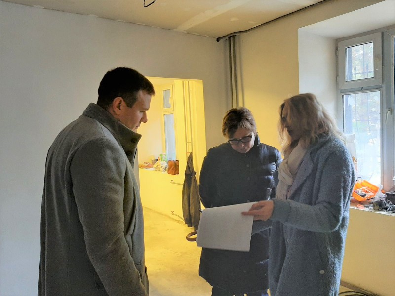 Вместе с подрядчиком и заместителем директора департамента общественных отношений Д.А. Кормщиковым депутат обсудила вопросы благоустройства: цветовую гамму стен, ремонт входной группы, обустройство освещения.