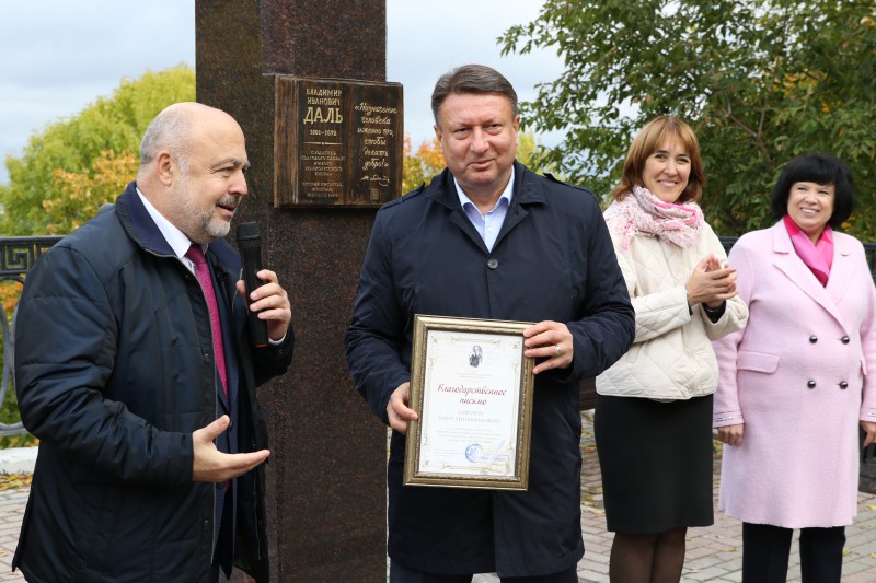 Павел Солодкий, один из инициаторов установки памятника, вручил Олегу Лавричеву Благодарственное письмо за вклад в работу по увековечению памяти Владимира Даля. «Сегодня Вы находитесь на той должности, которая позволяет изменить город. Ваши предшественники оставили после себя колоссальный труд. Сегодня Вы продолжаете его», – подчеркнул Павел Солодкий.