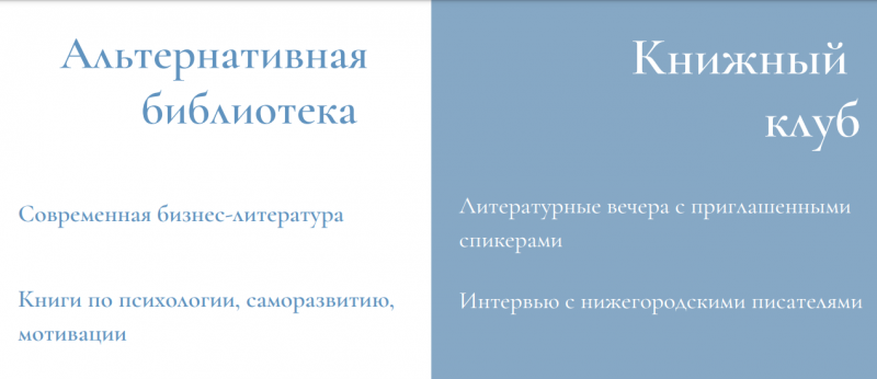 1. Альтернативная библиотека, предоставляющая жителям Нижнего Новгорода возможность доступа к печатным изданиям актуальной литературы (современная бизнес-литература, книги по психологии, саморазвитию), которая не представлена в городских библиотеках.