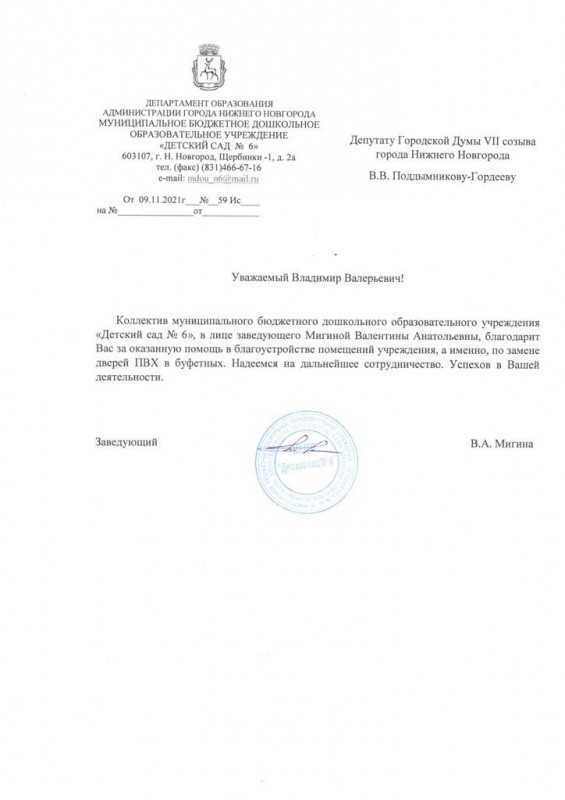 Коллектив МБДОУ «Детский сад №6» поблагодарил депутата городской Думы Нижнего Новгорода Владимира Поддымникова-Гордеева за оказанную помощь в благоустройстве помещений учреждения, а именно по замене дверец из ПВХ в буфетных. В адрес депутата поступило письмо с благодарностью за подписью заведующей Валентины Мигиной.
