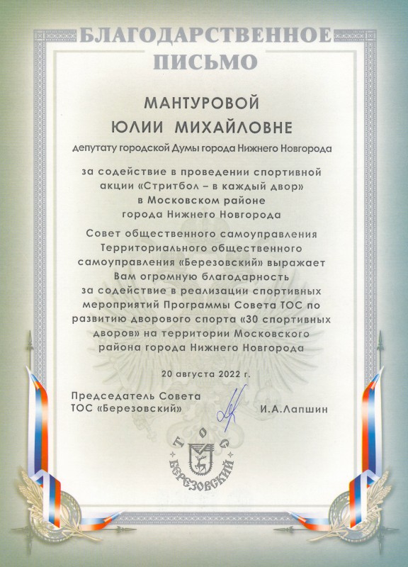 Совет ТОС микрорайона «Березовский» поблагодарил депутата за поддержку и выразил надежду на дальнейшее тесное сотрудничество в деле популяризации физкультуры и спорта как самой эффективной формы укрепления здоровья и профилактики негативных влияний в молодежной среде.