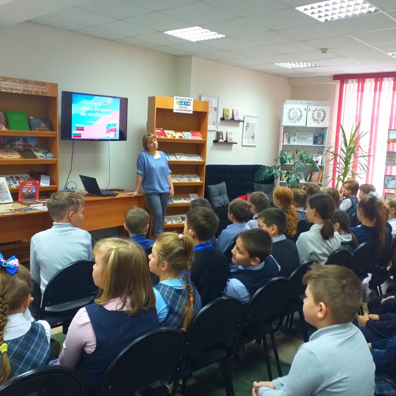 В библиотеке им. М.Ю. Лермонтова прошло патриотическое мероприятие «Пока мы едины, мы непобедимы» для учащихся МБОУ «Школа №171» в преддверии праздника Дня народного единства. Ребята слушали историческую лекцию о создании праздника, гимн народного единства, для них была проведена тематическая викторина. Дети внимательно слушали лекцию, смотрели ролики и отвечали на вопросы незамедлительно. По традиции, за внимательность ученики получили сладкие угощения. «Мероприятие получилось очень познавательным, ребятам очень понравилось принимать участие в нем, и мы решили, что соберёмся ещё. Считаю, что очень важно прививать патриотизм с малых лет», — поделилась своим мнением специалист по связям с общественностью О.Н. Артемьева.