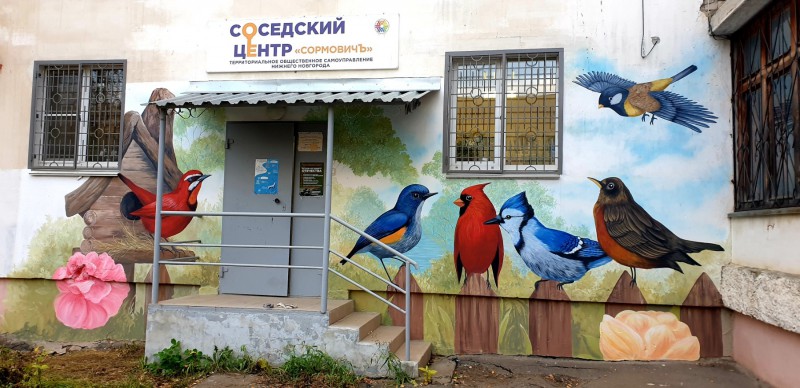 Художники завершили работы по украшению входной группы помещения территориального общественного самоуправления центра Сормова и микрорайона Вождей революции. Теперь фасад помещения украшают яркие птички и его видно издалека. Теперь мы будем ещё более заметнее для жителей. Благодарим художников за проделанную работу.