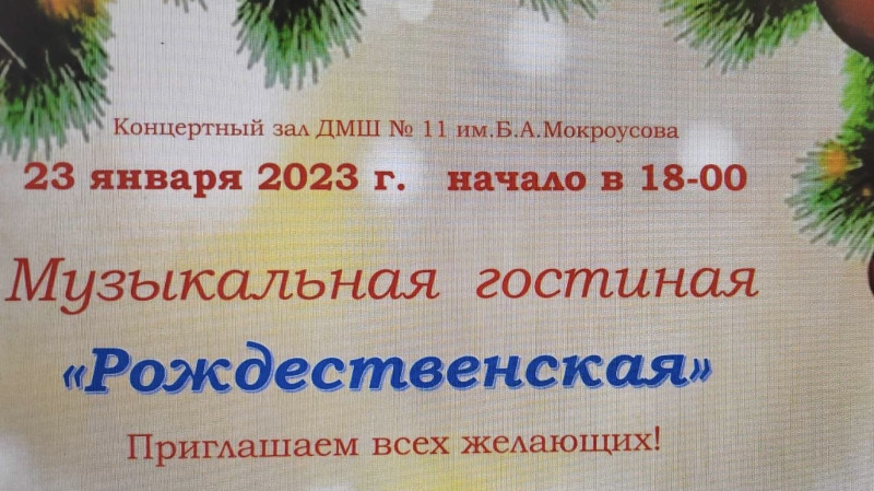 В концертном зале Детской музыкальной школы № 11 им. Б.А.Мокроусова 23 января состоялась Музыкальная гостиная «Рождественская», где присутствовали активисты ТОС центра Сормова и микрорайона Вождей революции. Выступили артисты на гитаре и балалайке, фортепиано. Программа насыщенная и интересная.
