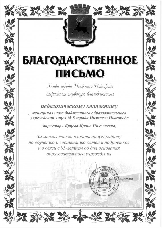 Глава города О.В. Сорокин, который является депутатом городской Думы по 22-ому избирательному округу, направил свои поздравления в адрес директора лицея Ярцевой И.Н. и коллектива школы.