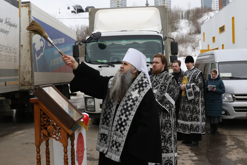 Автомобили с гуманитарной помощью для мобилизованных граждан и военнослужащих Министерства обороны Российской Федерации освятил Митрополит Нижегородский и Арзамасский Георгий.