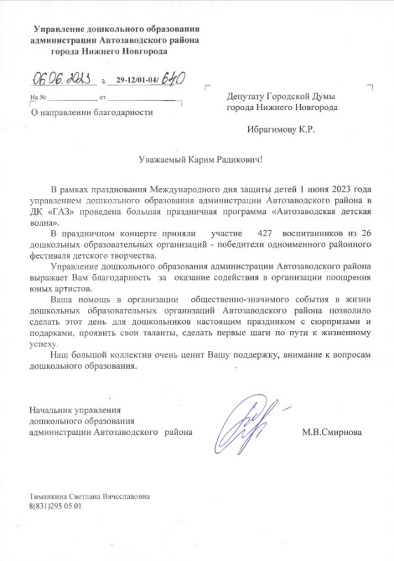 6 июня 2023 года управление дошкольного образования администрации Автозаводского района направило Благодарственное письмо в адрес депутата городской Думы Нижнего Новгорода Карима Ибрагимова за оказанную помощь в организации мероприятия «Автозаводская детская волна», приуроченного к Международному дню защиты детей.