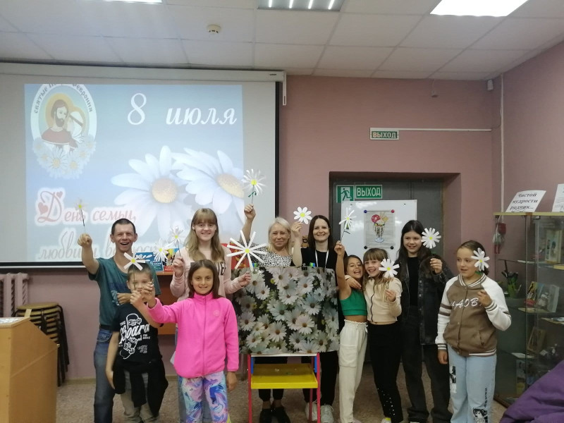 День семьи, любви и верности — один из самых молодых государственных праздников России. 8 июля православные христиане отмечают день памяти святых Петра и Февронии, покровителей супружеской любви и семейного счастья. Символ праздника семьи — скромный цветок ромашки. Ромашка стала символом праздника неслучайно, ведь в День святых благоверных Петра и Февронии в русских полях и лугах цветут ромашки, и издавна этот полевой цветок считается в нашей стране символом любви. Данный символ встречается на всех предметах и изображениях, посвящённых празднику. Яркая и жизнерадостная ромашка помогает сделать праздник узнаваемым и популярным. Председатель ТОС № 16 поселка Мостоотряд Людмила Симонова и сотрудники библиотеки им. Радищева подготовили и провели для детей поселка Мостоотряд праздничную программу, посвящённую Дню семьи, любви и верности. Дети с удовольствием сделали замечательные ромашки из цветной бумаги своими раками и приняли участие в интерактивной программе.