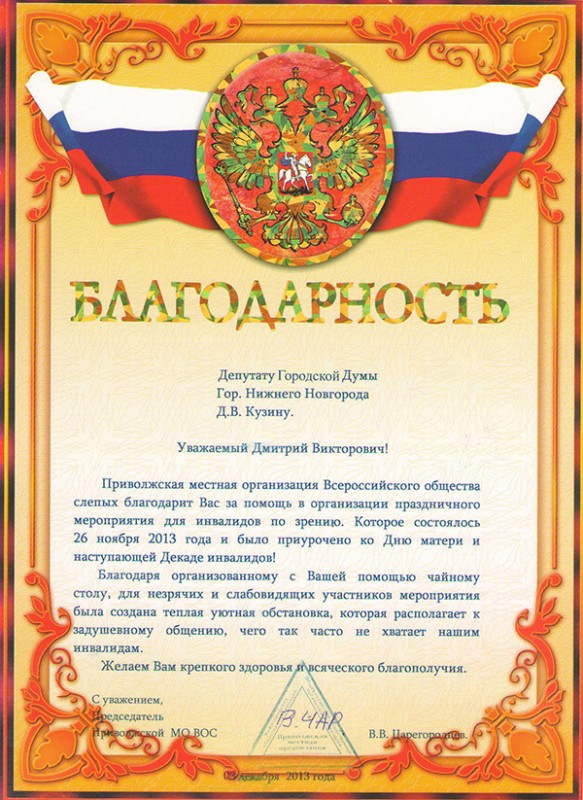 Приволжская местная организация «Всероссийское общество слепых» выразила благодарность депутату городской Думы Нижнего Новгорода Дмитрию Кузину за организацию праздничного мероприятия, приуроченного ко Дню матери и Декаде инвалидов.