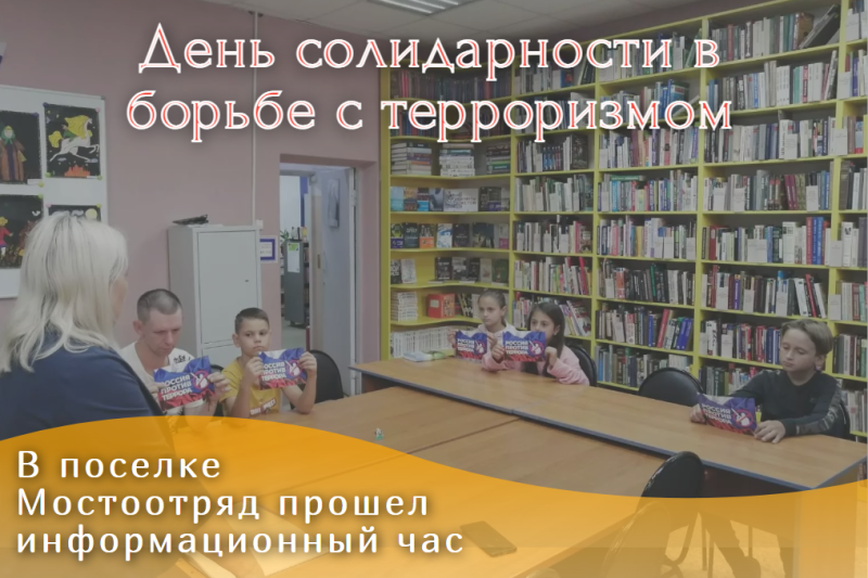 Ежегодно 3 сентября отмечается памятная дата — День солидарности в борьбе с терроризмом. Этот день призван символизировать объединение государства и общества в борьбе с общим врагом. Дети и взрослые в России и во всем мире должны знать, что с терроризмом необходимо не только бороться, гораздо важнее и эффективнее предупреждать его возникновение. В библиотеке им. Радищева ребята присоединились к информационной беседе «Россия против террора». «Присутствовавшие узнали определение таких слов как „террор“, „терроризм“, „теракт“, „экстремизм“, „террористы“. Вспомнили о трагедии, которая произошла в Беслане с 1 по 3 сентября в 2004 г. Узнали об истории возникновения терроризма в мире. Проговорили как вести себя в случае возникновения теракта и в экстренных ситуациях, а также об ответственности каждого за спокойствие и порядок в нашей стране. Каждый смог поделиться своим мнением по данному вопросу», — рассказала председатель Совета ТОС № 16 поселка Мостоотряд Л.Н. Симонова.