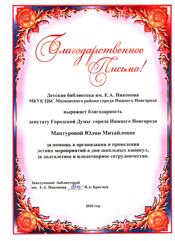 5 октября 2023 года коллективы детской библиотеки им. Е.А. Никонова и библиотеки семейного чтения Московского района направили в адрес депутата городской Думы Нижнего Новгорода Юлии Мантуровой благодарственные письма.