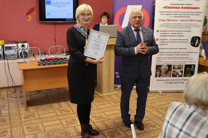 24 октября 2023 года председатель городской Думы города Нижнего Новгорода Олег Лавричев вместе с региональным координатором партийного проекта «Старшее поколение» Владимиром Тарасовым дали старт пилотному проекту «Кнопка помощи» для мониторинга здоровья пожилых людей и оперативного информирования их родственников или соцработников о нештатной ситуации. Проект реализуется при поддержке партии «Единая Россия» на средства президентского гранта.
