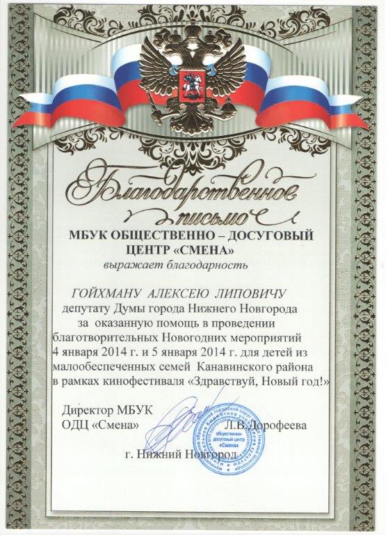 В адрес депутата Гойхмана А.Л. от коллектива кинотеатра "Смена" (директор Дорофеева Л.В.) поступило благодарственное письмо за помощь в организации Новогодних праздников, а также за чуткое внимание и понимание проблем развития муниципального учреждения.