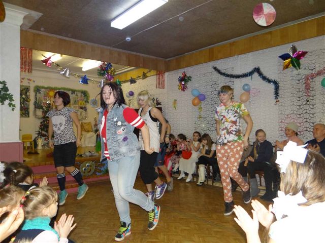 Воспитанники клуба показали зрителям театрализованное представление, где злые разбойники похитили внучку Деда Мороза, а дети вместе с персонажами из известных сказок: котом Базилио и лисой Алисой, бабой Ягой, домовенком Кузей, Бабками Ежками и, конечно же, Дедом Морозом, с песнями и танцами искали Снегурочку. Подростки из группы FMB исполнили танец Бабок Ежек. В конце все вместе водили хоровод, играли в игру «Заморожу, заморожу!», каждый желающий рассказал Деду Морозу стихотворение. Все дети получили сладкие призы от ТОС № 6.