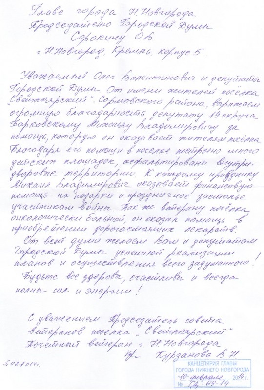 На имя главы города Нижнего Новгорода О.В.Сорокина, депутатов городской Думы поступило письмо от имени Почетного ветерана Нижнего Новгорода, председателя совета ветеранов поселка «Светлоярский» В.Н.Курзановой с выражением благодарности депутату городской Думы по избирательному округу №19 Михаилу Владимировичу Барковскому за помощь, оказываемую им жителям поселка. Благодаря помощи депутата построены детские площадки, асфальтированы внутридомовые территории, а к каждому празднику депутат оказывает финансовую помощь на подарки и праздничное застолье для участников Великой Отечественной войны. М.В.Барковский приобрел необходимые лекарства для тяжелобольного ветерана. Всем депутатам В.Н.Курзанова пожелала сил и энергии для осуществления задуманных планов.