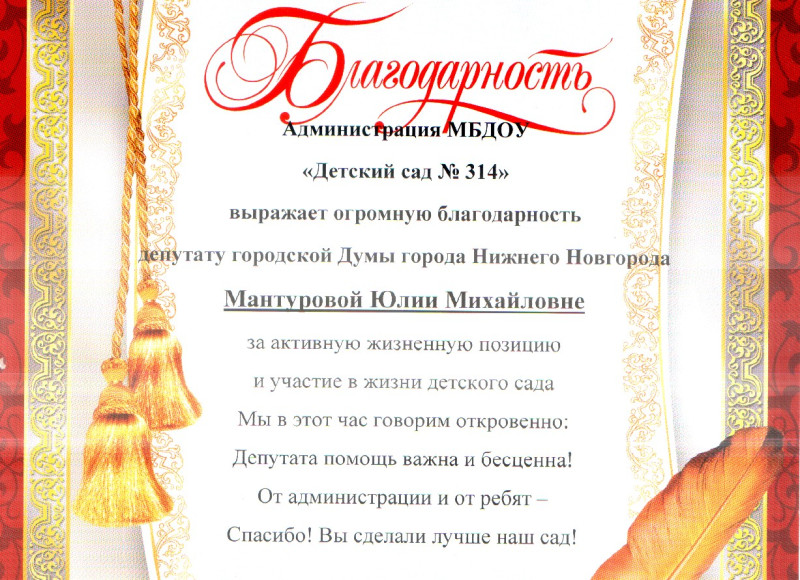 Администрации и педагогические коллективы детских садов №№ 184 и 314 выражают благодарность депутату городской Думы Юлии Мантуровой за активную помощь и поддержку дошкольных учреждений округа № 20 Московского района.