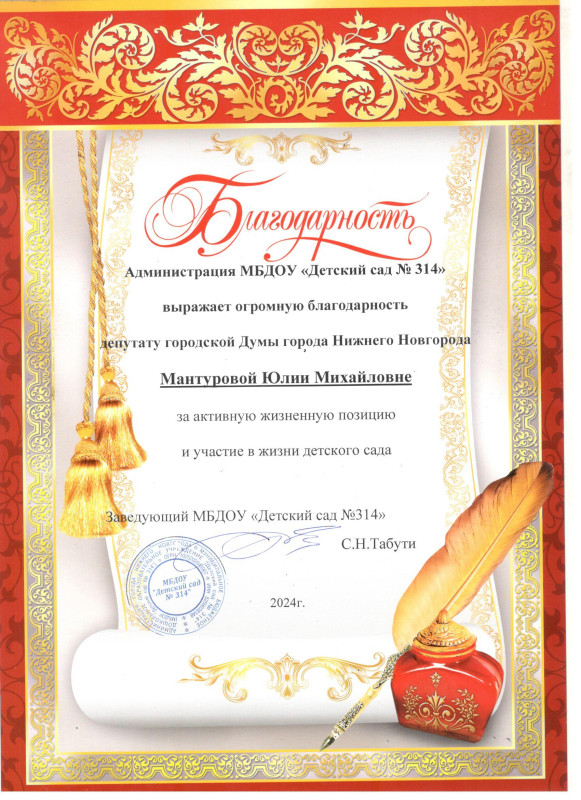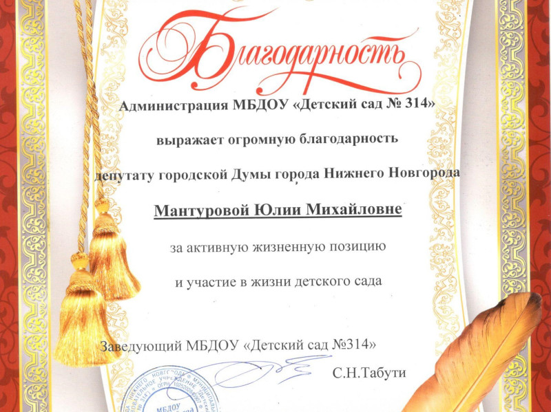 Администрации и коллективы детских садов Московского района выражают благодарность депутату городской Думы Юлии Мантуровой за активную помощь и поддержку дошкольных учреждений округа № 20 Московского района.