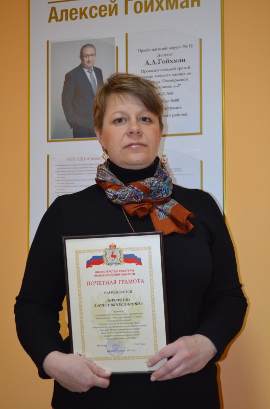 В рамках празднования Дня Культуры депутат А.Л.Гойхман инициировал и поддержал вручение директору детского кинотеатра «Смена» Ларисе Дорофеевой благодарственного письма от министра культуры правительства Нижегородской области Сергея Горина. Кроме этого, сотрудники коллектива получили благодарственные письма от директора департамента культуры администрации Нижнего Новгорода Ларисы Моториной и денежные премии.