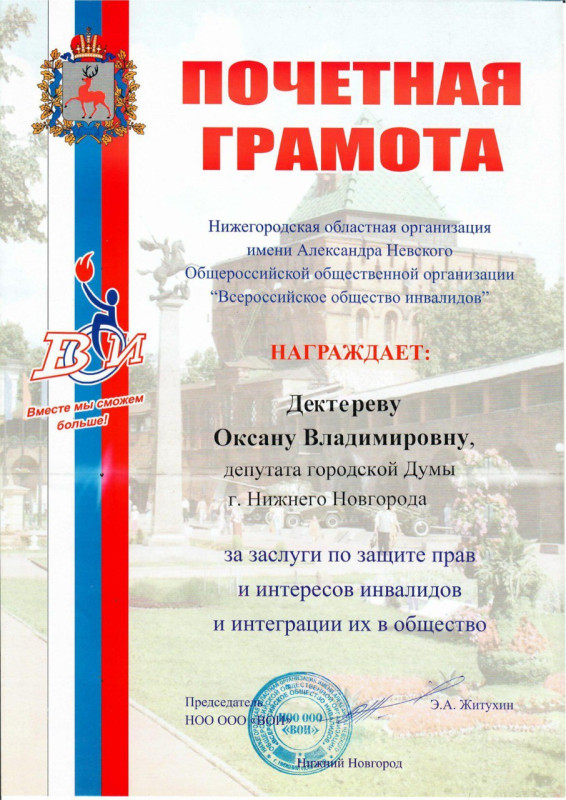 Оксана Дектерева получила благодарственное письмо от Нижегородской областной организации Всероссийского общества инвалидов