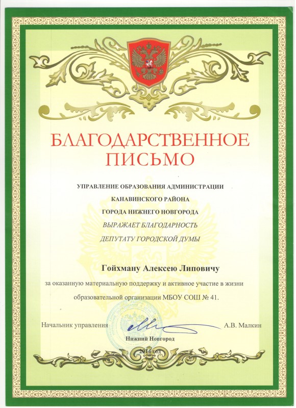 За всестороннюю помощь в оснащении школы, за участие в мероприятиях, и за постоянное внимание в адрес депутата А.Л.Гойхмана поступило благодарственное письмо от коллектива и учеников МОУСОШ № 41.