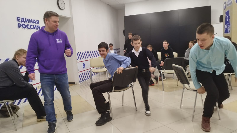 Педагог-организатор Нижегородского Театра Юного Зрителя Денис Дворянинов провел для ребят тренинг по актерскому мастерству, включающий упражнения на импровизацию, которые дети успешно выполнили.