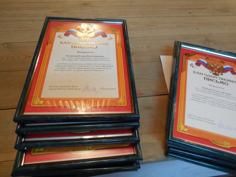 22 Мая в ДДК им. Бринского при финансовой поддержке депутата городской Думы Балакиной Ольги Валериевны совместно с администрацией Нижегородского района и советом самоуправления микрорайона Верхние Печеры состоялось торжественное мероприятие, посвященное 20-летию создания Советов территориального общественного самоуправления в городе Нижнем Новгороде.