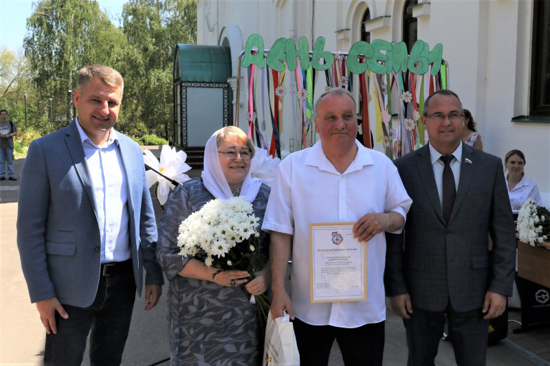 В ходе церемонии чествования супружеских пар района благодарственными письмами и подарками были отмечены молодая семья врачей - Денис и Варвара Безрукавниковы, воспитывающие двоих детей супруги Виктор Ладаускас и Елена Ладаускиени, отметившие золотую свадьбу Валерий и Елена Мольковы, а также Герман и Галина Ждановы, прожившие в законном браке 60 лет. Под звуки марша Мендельсона пары вновь приняли участие в торжественной церемонии бракосочетания.