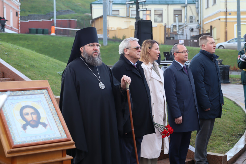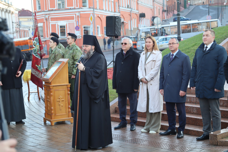 Участники мероприятия возложили цветы к памятнику Кузьме Минину и Дмитрию Пожарскому. Особой торжественности моменту придал чин окропления копии знамени Народного ополчения 1612 года, который совершил епископ Иннокентий.