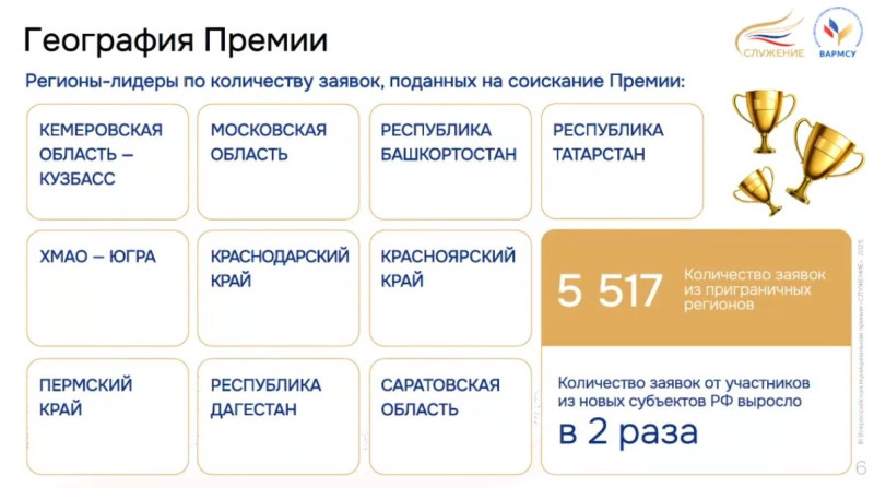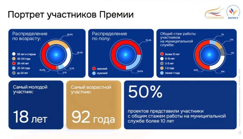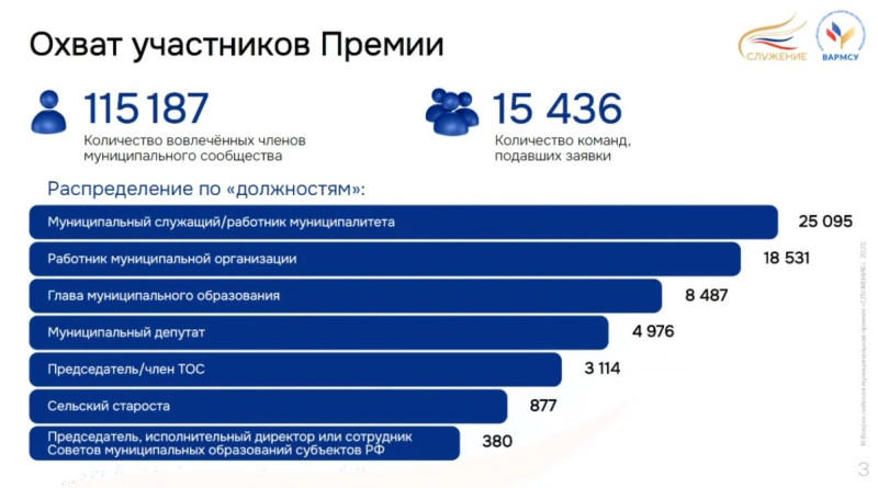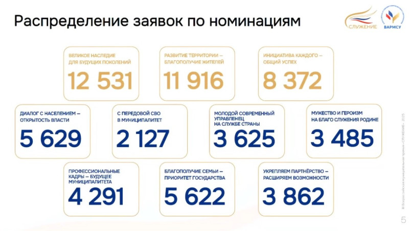 Как было озвучено в ходе пресс-конференции, в оргкомитет поступило 61,4 тысячи индивидуальных и командных заявок в 10 номинациях: «Мужество и героизм на благо служения Родине», «Благополучие семьи — приоритет государства», «Развитие территории — благополучие жителей», «Укрепляем партнерство — расширяем возможности», «Инициатива каждого — общий успех», «Великое наследие для будущих поколений», «Диалог с населением — открытость власти», «Молодой современный управленец на службе страны», «С передовой СВО в муниципалитет», «Профессиональные кадры — будущее муниципалитета». 34% соискателей заявились на участие в премии повторно. Самыми старшими авторами проектов стали муниципальные депутаты – 92-летний житель Нальчика Кабардино-Балкарии с депутатским стажем более 17 лет и 87-летняя представительница Тульской области, которую избиратели поддерживают уже в течение 40 лет.