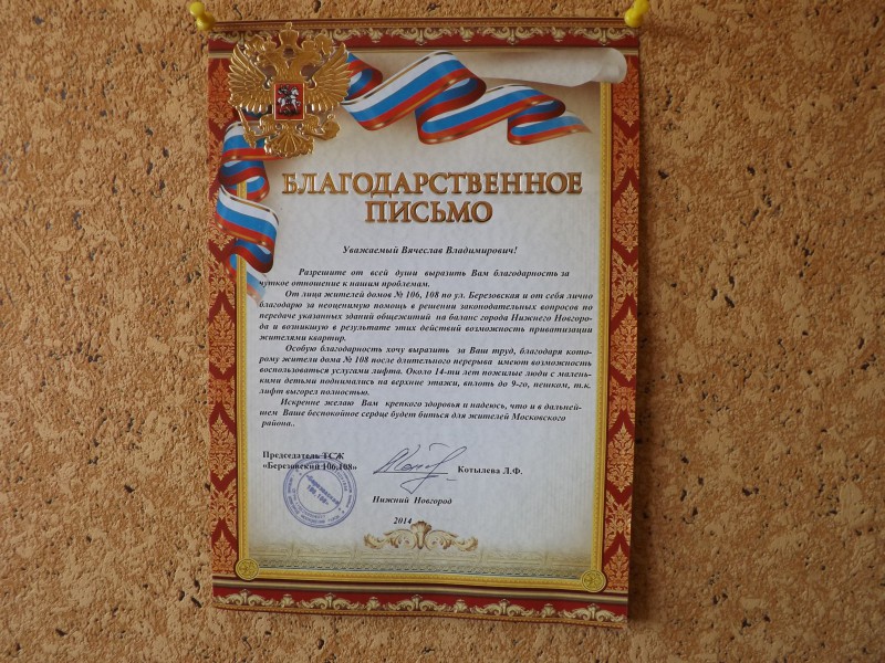 В ноябре 2012г. к депутату обратилась председатель ТСЖ «Березовская 106,108» Котылева Л.Ф. по поводу ремонта лифта, который сгорел в начале 90-х годов. Несмотря на неоднократные обращения во многие инстанции, жителям дома в течение почти 14-ти лет приходилось подниматься пешком вплоть до 9-го этажа, а это, в основном, были пожилые люди и маленькие дети.