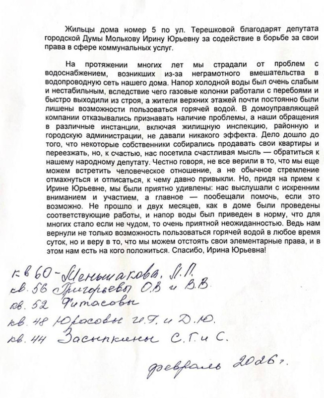В результате совместных усилий команды депутата и активных жителей вопрос был решен положительно. В знак благодарности за проявленное внимание и действенную помощь жильцы дома направили в адрес парламентария официальное благодарственное письмо.