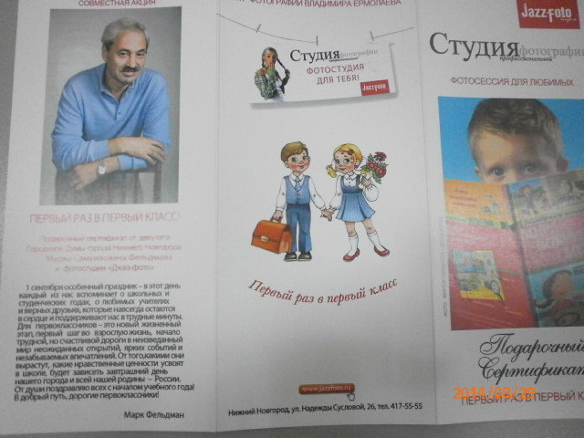 Депутат городской Думы города Нижнего Новгорода Марк Фельдман от всей души поздравил всех с началом учебного года. Каждому первокласснику был вручен подарочный сертификат для бесплатной фотосессии в студии фотографии.