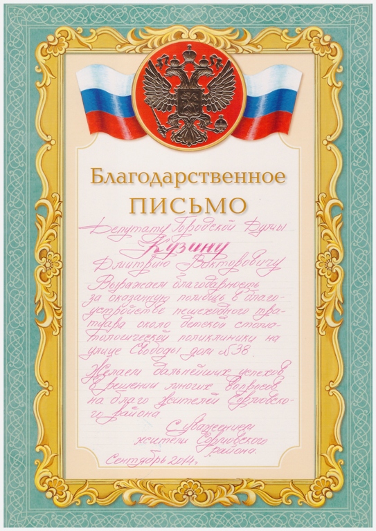 "Выражаем благодарность за оказанную помощь в благоустройстве пешеходного тротуара около детской стоматологической поликлиники на ул. Свободы, 38", - поблагодарили сормовичи депутата Гордумы Нижнего Новгорода Дмитрия Кузина.
