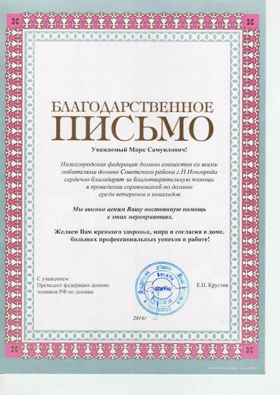 Нижегородская федерация домино совместно со всеми любителями домино Советского района города Нижнего Новгорода сердечно благодарят депутата городской Думы города Нижнего Новгорода Марка Самуиловича Фельдмана за благотворительную помощь в проведении соревнований по домино среди ветеранов ВОВ и инвалидов.