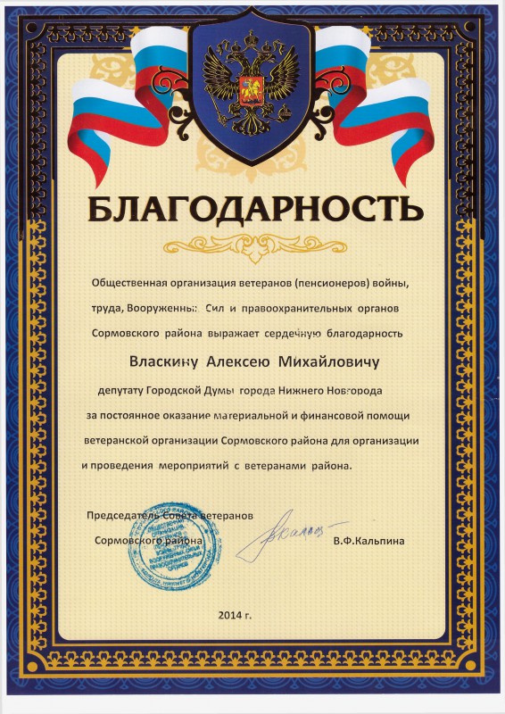 Общественная организация ветеранов (пенсионеров) войны, труда, вооруженных сил и правоохранительных органов Сормовского района выражает сердечную благодарность Власкину Алексею Михайловичу, депутату городской Думы г.Нижнего Новгорода за постоянное оказание материальной и финансовой помощи ветеранской организации Сормовского района для организации и проведения мероприятий с ветеранами района.