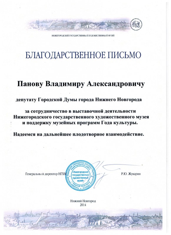 Нижегородский государственный художественный музей благодарит депутата городской Думы Владимира Александровича Панова за сотрудничество в выставочной деятельности музея и поддержку музейных программ Года культуры.