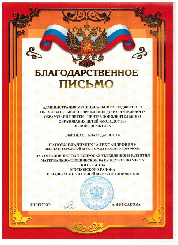Администрация муниципального бюджетного образовательного учреждения дополнительного образования детей – центра дополнительного образования детей «Молодость» в лице директора Анны Николаевны Русаковой выражает благодарность депутату городской Думы Владимиру Александровичу Панову за сотрудничество в вопросах укрепления и развития материально-технической базы клубов по месту жительства Московского района и надеется на дальнейшее сотрудничество.