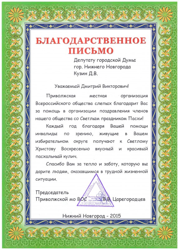 Приволжская местная организация «Всероссийское общество слепых» выразила благодарность депутату Думы Нижнего Новгорода Дмитрию Кузину за помощь в организации поздравления с Пасхой инвалидов по зрению.