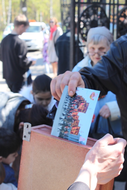 Сормовичам предлагали заполнить почтовые открытки с иллюстрациями на тему Великой Отечественной войны и Победы и отправить её совершенно бесплатно своим родственникам и друзьям, опустив в наш почтовый ящик. От желающих поздравить родных с праздником не было отбоя, и за открытками выстраивались очереди. Дети с мамами, ветераны войны, школьники, студенты, отдыхающие в парке... Всем хотелось отправить "Открытку из прошлого" своим близким!