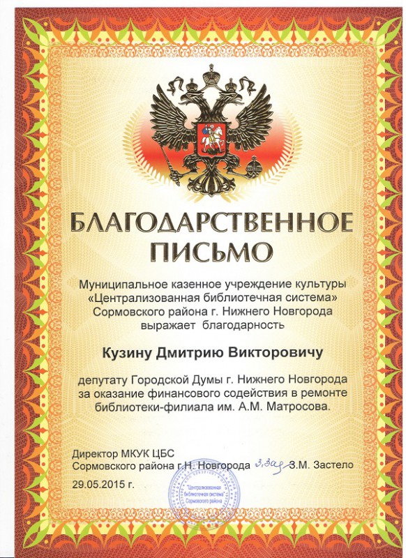 29 мая состоялось торжественное открытие после ремонта библиотеки им. Матросова на улице Сутырина, 6 в Сормовском районе Нижнего Новгорода. На ремонт библиотеки было выделено более 700 тыс. рублей, в том числе по инициативе депутата Думы Нижнего Новгорода Дмитрия Кузина в 2014 году из городского бюджета были выделены 100 000 рублей. Кроме того, к открытию депутат сделал учреждению подарок - он предоставил библиотеке большой набор книг издательства "Кварц" на общую сумму около 10 000 рублей для укомплектования библиотечного фонда.