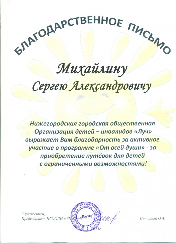 Нижегородская городская общественная организация детей-инвалидов «Луч» выражает благодарность депутату Сергею Александровичу Михайлину за активное участие в программе «От всей души»: за приобретение путевок для детей с ограниченными возможностями!