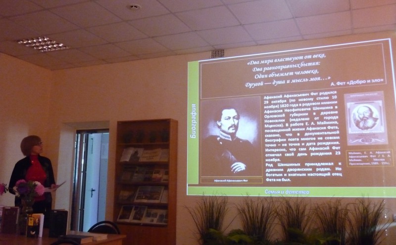 Участники Литературной гостиной Территориального общественного самоуправления квартала Энгельса и бульвара Юбилейный прекрасно провели время в Центральной городской библиотеке им. 1 Мая, посетив мероприятие, посвященное творчеству Афанасия Фета. Слушатели познакомились с биографией и творческой деятельностью поэта.