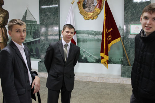 Игорь Валентинович провёл нас по коридорам здания, рассказал о зарождении местного самоуправления в Нижнем Новгороде и истории его развития до наших дней. Мы посетили кабинет главы города. К сожалению, нам не удалось застать его на месте, но зато мы увидели современное рабочее место делового человека с прекрасными видами старого Нижнего. Большой стол для конференций говорит о том, что многие вопросы рассматриваются и решаются сообща. Затем нас провели в главный зал заседаний депутатов городской Думы, где нам была предоставлена полная свобода действий. Мы увидели своими глазами то место, которое часто показывают по телевизору, и почувствовали всю значимость происходящих здесь событий. Кто знает, может, среди нас есть человек, который в недалёком будущем займёт одно из этих кресел.