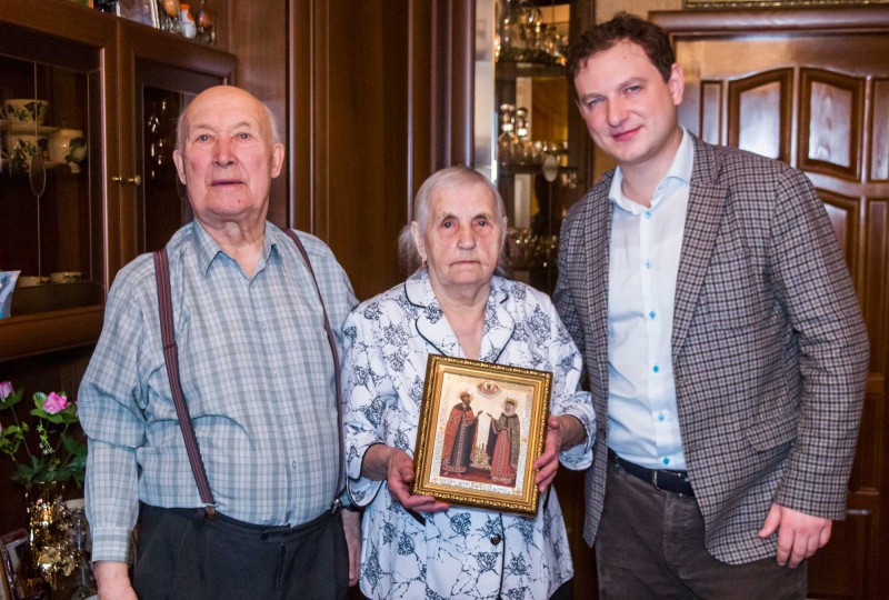 Руководитель фракции КПРФ в городской Думе, промышленник и меценат Михаил Сухарев поздравил семейную пару со знаменательной датой, пожелал долгих лет жизни и подарил икону Петра и Февронии, покровителей семьи, любви и верности.