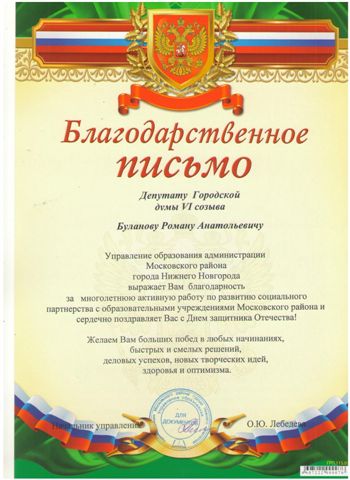 Управление образования администрации Московского района города Нижнего Новгорода выражает Вам благодарность за многолетнюю активную работу по развитию социального партнерства с образовательными учреждениями Московского района и сердечно поздравляет Вас с Днем защитника Отечества!