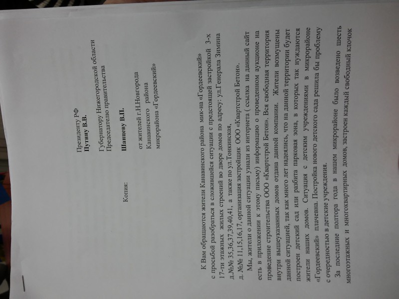 Несогласие с итогами аукциона и решением застроить и без того тесный микрорайон с дефицитом мест в детских садах и школах выразили жители и, поддержанные депутатом Гойхманом А.Л., отправили обращение с подписями поддержки в адрес Президента РФ, с копией в адрес Губернатора Нижегородской области Шанцева В.П., а также в Общероссийский Народный Фронт и в Федеральные СМИ.