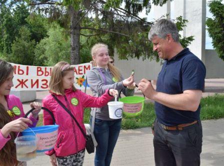 Всех прохожих с сигаретами ребята встречали с лозунгом: «Брось сигарету-получишь конфету!». Каждый участник акции в одно ведерко с водой бросал сигарету, а из другого доставал себе конфету.
