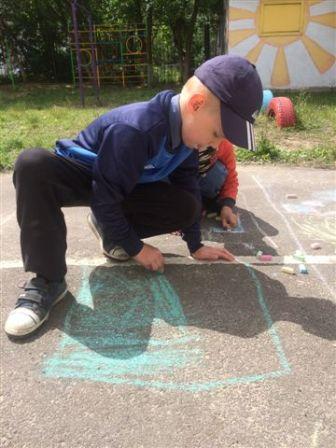 Юные художники из детского сада № 453 разукрасили всю асфальтовую дорожку. Малыши с увлечением принялись за работу. Для каждого был выделен квадрат, на который ручками ребят наносились патриотические рисунки, олицетворяющие радость, чистое небо и просто по-детски беззаботное хорошее настроение. Художественные произведения получились запоминающимися и неповторимыми: кремль, флаг, герб, лето — основа почти каждого рисунка.
