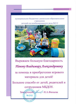 Муниципальное дошкольное образовательное учреждение детский сад комбинированного вида № 212 выражает большую благодарность Панову Владимиру Александровичу за помощь в приобретении игрового материала для детей.