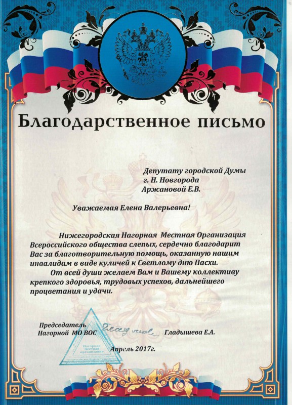 Нижегородская Нагорная местная организация Всероссийского общества слепых, сердечно благодарит Вас за благотворительную помощь, оказанную нашим инвалидам в виде куличей к Светлому дню Пасхи.